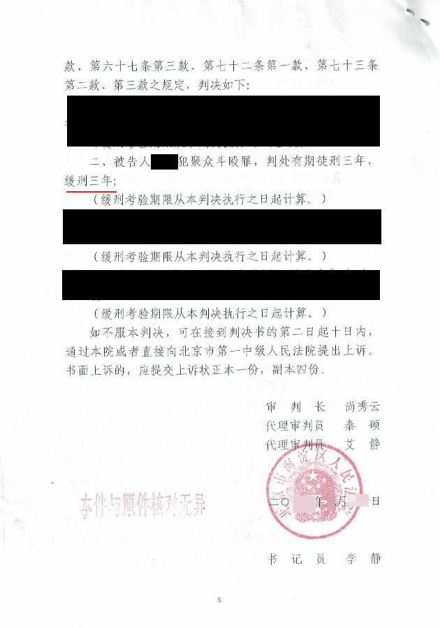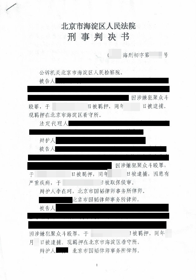 在校学生因聚众斗殴被检察院提起公诉,量刑建议七年,经李在珂律师成功辩护,被缓刑处理。注:为保护案件当事人的个人隐私及涉及国家机密案件、有伤社会风化及其它不宜公开的案件,我们特对案件当事人的姓名、籍贯、住址、单位名称等做了隐藏技术处理,并只公布了判决文书的首页(显示李在珂是本案辩护律师)、尾页(显示判决结果),以证明李在珂律师所辩护的成功案例的真实性!特此说明!