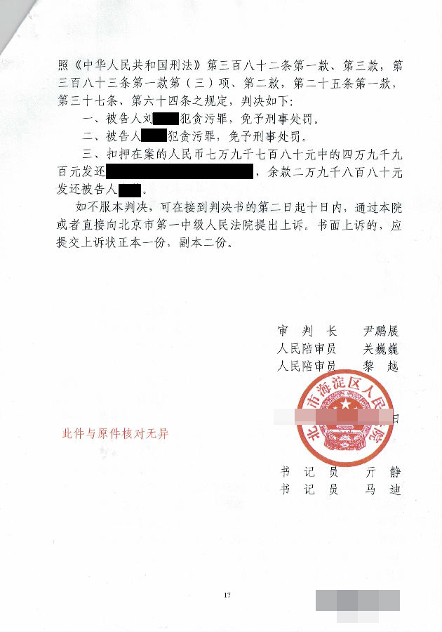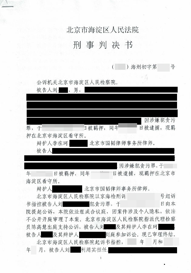 胡某因贪污罪被海淀区检察院建议判处有期徒刑十四年,经李在珂律师成功辩护,最终判处免予刑事处罚。注:为保护案件当事人的个人隐私及涉及国家机密案件、有伤社会风化及其它不宜公开的案件,我们特对案件当事人的姓名、籍贯、住址、单位名称等做了隐藏技术处理,并只公布了判决文书的首页(显示李在珂是本案辩护律师)、尾页(显示判决结果),以证明李在珂律师所辩护的成功案例的真实性!特此说明!