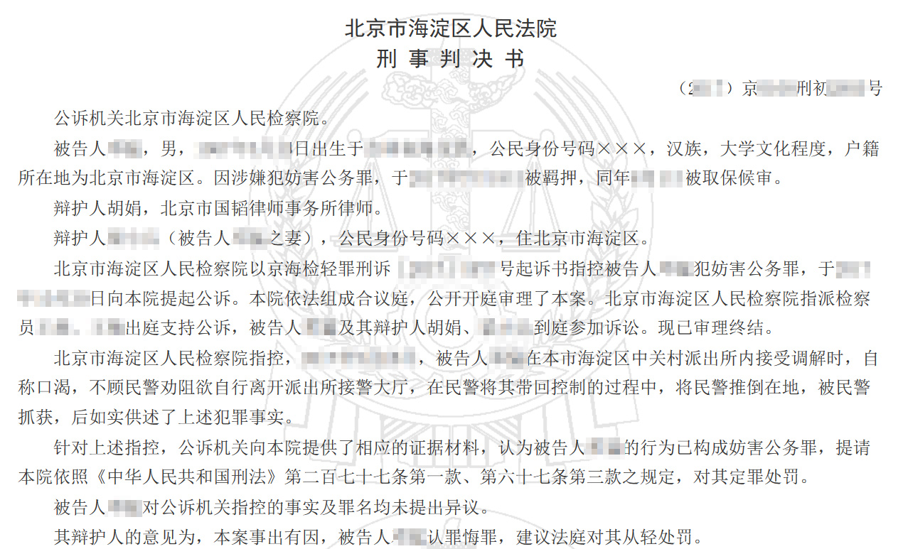 王某涉嫌妨害公务被海淀公安分局刑拘,经北京市国韬律师事务所李在珂律师团队胡娟律师成功辩护,办案机关决定变更其强制措施,取保候审处理。最后被海淀法院判决单处罚金一万元。注:为保护案件当事人的个人隐私及涉及国家机密案件、有伤社会风化及其它不宜公开的案件,我们特对案件当事人的姓名、籍贯、住址、单位名称等做了隐藏技术处理,并只公布了判决文书的首页(显示李在珂律师团队是本案辩护律师)、尾页(显示判决结果),以证明李在珂律师团队所辩护的成功案例的真实性!特此说明!