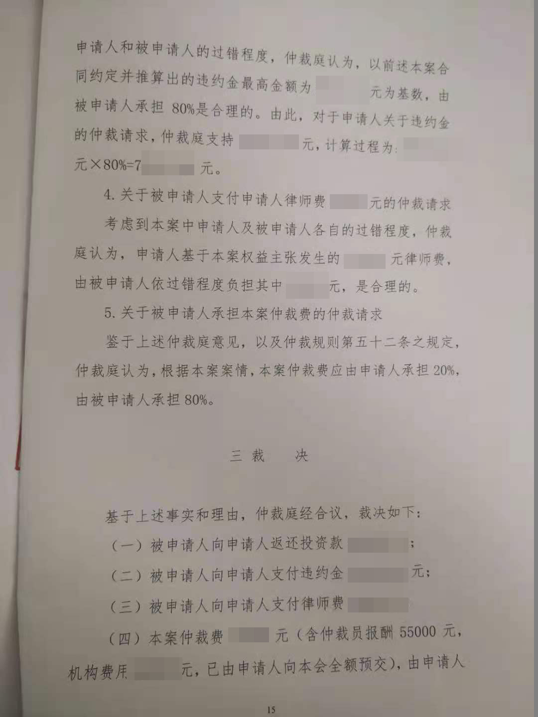 王某因听说投资电影能赚钱,与一家公司签订合同,投资了某电影,结果电影上映后对方公司说影片亏损,连本金都未返还。经北京市国韬律师事务所刘亚华律师提供法律帮助,北京市仲裁委员会裁决退回所有本金,并支付违约金和赔偿律师费。注:为保护案件当事人的个人隐私及涉及国家机密案件、有伤社会风化及其它不宜公开的案件,我们特对案件当事人的姓名、籍贯、住址、单位名称等做了隐藏技术处理,并只公布了判决文书的首页(显示国韬律师团队律师是本案辩护律师)、尾页(显示判决结果),以证明国韬律师团队律师辩护的成功案例的真实性!特此说明!