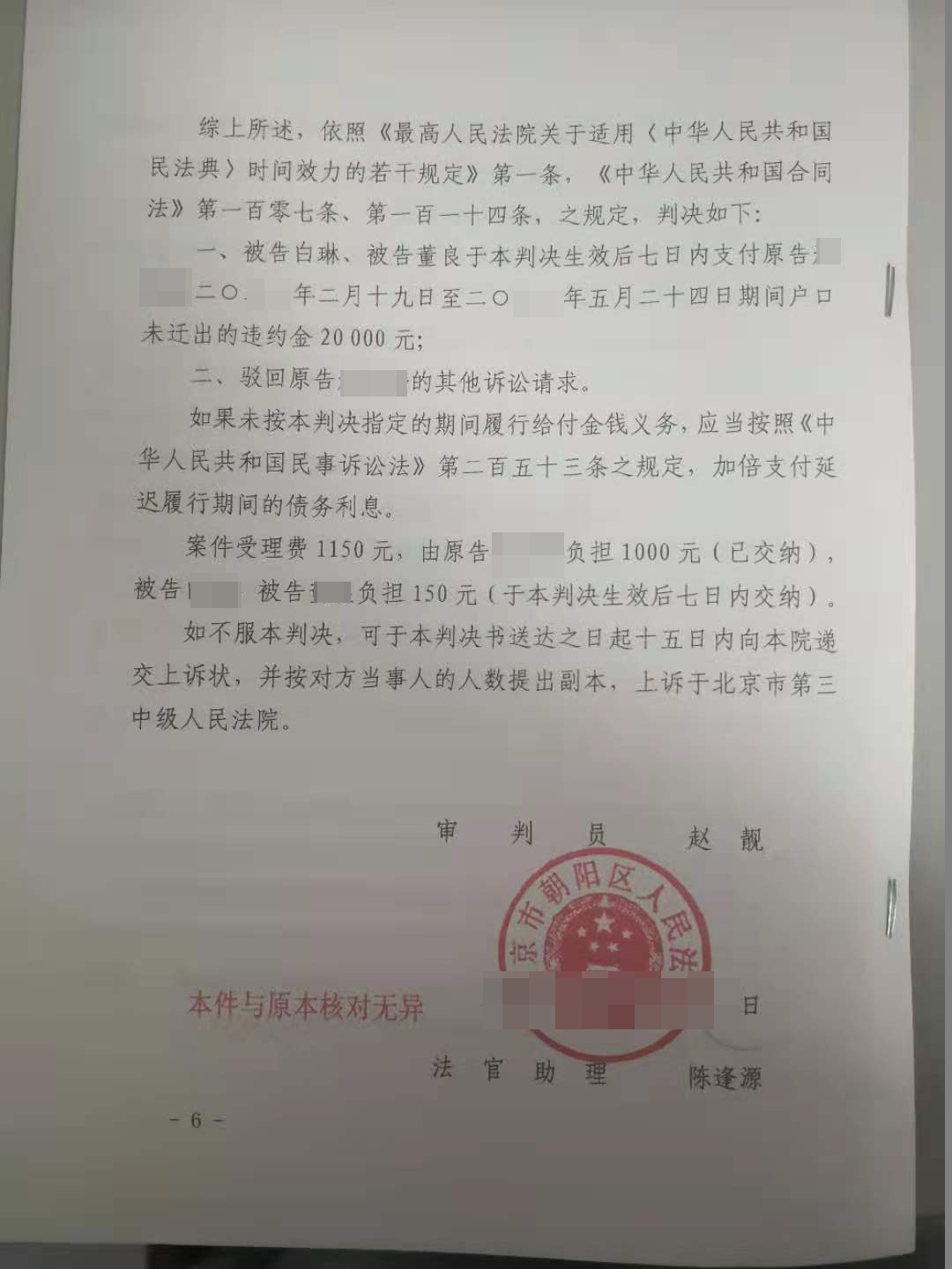 李某与王某和杨某签订了房屋买卖合同,当时约定王某和杨某在房产过户后五年内迁出户口,结果王某和杨某并未按期将户口迁出。经北京市国韬律师事务所宣玥律师和张帆律师提供法律帮助,北京市朝阳区人民法院判决三个月逾期时间赔偿违约金两万元。之后若对方仍不迁出户口可另案起诉继续索赔。注:为保护案件当事人的个人隐私及涉及国家机密案件、有伤社会风化及其它不宜公开的案件,我们特对案件当事人的姓名、籍贯、住址、单位名称等做了隐藏技术处理,并只公布了判决文书的首页(显示国韬律师团队律师是本案辩护律师)、尾页(显示判决结果),以证明国韬律师团队律师辩护的成功案例的真实性!特此说明!