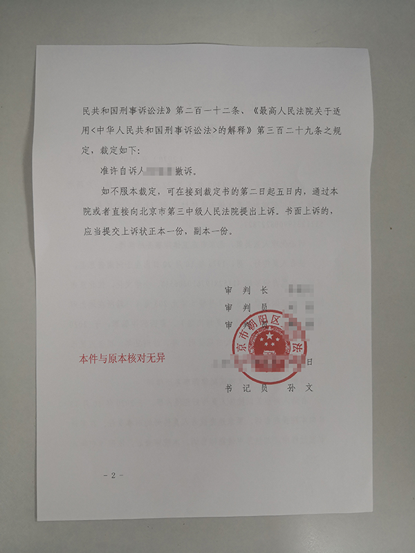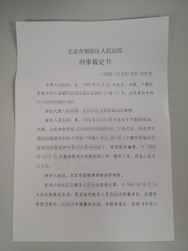 刘某某因诈骗罪被刑事拘留,经北京市国韬律师事务所李在珂律师团队宣玥律师提供法律帮助,北京市朝阳区人民法院一审被判处缓刑。缓刑期间刘某某又被他人以侵占罪提起刑事自诉,如果一旦自诉成功,刘某某将被撤销缓刑,诈骗罪与侵占罪数罪并罚。经宣玥律师提供帮助,对方放弃了诉求,撤回了自诉。注:为保护案件当事人的个人隐私及涉及国家机密案件、有伤社会风化及其它不宜公开的案件,我们特对案件当事人的姓名、籍贯、住址、单位名称等做了隐藏技术处理,并只公布了判决文书的首页(显示李在珂是本案辩护律师)、尾页(显示判决结果),以证明李在珂律师所辩护的成功案例的真实性!特此说明!