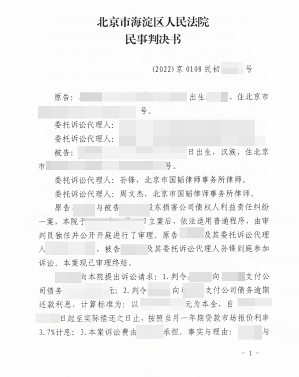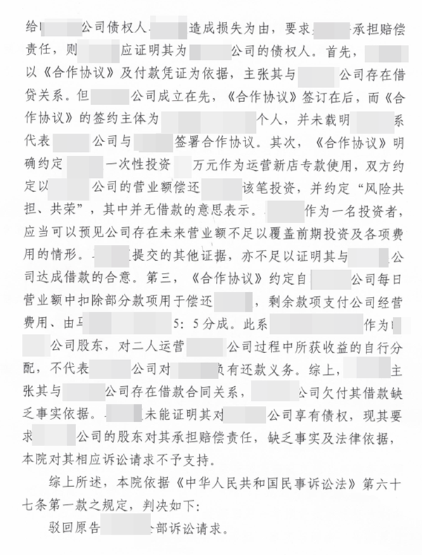 马某和吴某合作开了家公司,后经营不善公司注销。马某向海淀法院起诉吴某,主张自己前期投入的资金是对公司的借款,要求吴某作为股东进行偿还。吴某收到法院传票后委托北京市国韬律师事务所代理本案,经北京市国韬律师事务所孙锋律师、周文杰律师提供法律帮助,北京市海淀区人民法院判决驳回原告所有诉讼请求。注:为保护案件当事人的个人隐私及涉及国家机密案件、有伤社会风化及其它不宜公开的案件,我们特对案件当事人的姓名、籍贯、住址、单位名称等做了隐藏技术处理,并只公布了判决文书的首页(显示国韬律师团队律师是本案辩护律师)、尾页(显示判决结果),以证明国韬律师团队律师辩护的成功案例的真实性!特此说明!