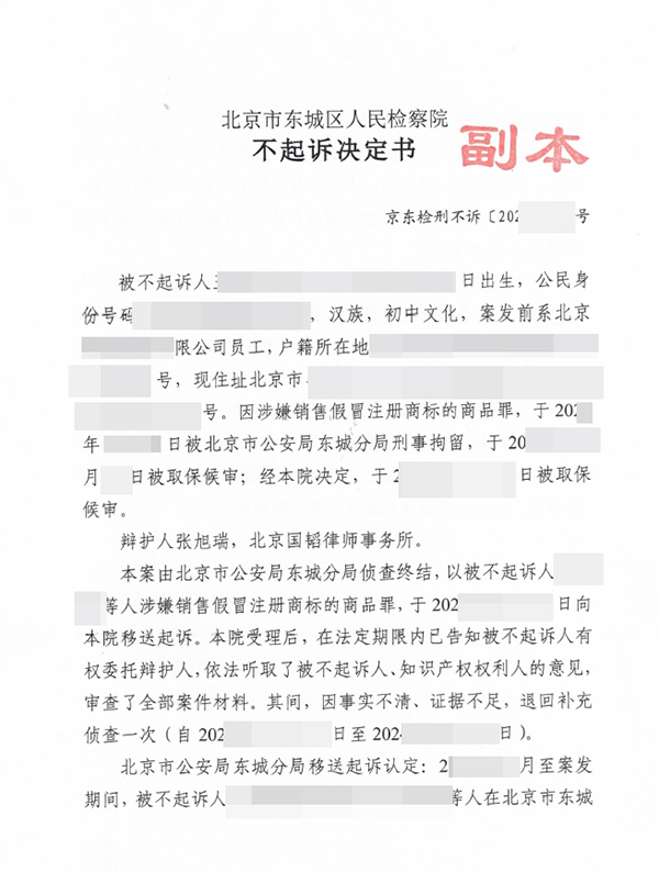 许某是一家公司的员工,因为涉嫌销售假冒注册商标的商品罪被北京市公安局东城分局刑事拘留,刑拘后家属委托北京市国韬律师事务所介入,经李在珂律师团队张旭瑞律师提供法律帮助,成功取保候审,并且后续东城检察院采纳了律师提交的不予起诉的法律意见,决定不起诉处理。注:为保护案件当事人的个人隐私及涉及国家机密案件、有伤社会风化及其它不宜公开的案件,我们特对案件当事人的姓名、籍贯、住址、单位名称等做了隐藏技术处理,并只公布了判决文书的首页(显示李在珂律师团队律师是本案辩护律师)、尾页(显示判决结果),以证明李在珂律师团队律师律师所辩护的成功案例的真实性!特此说明!